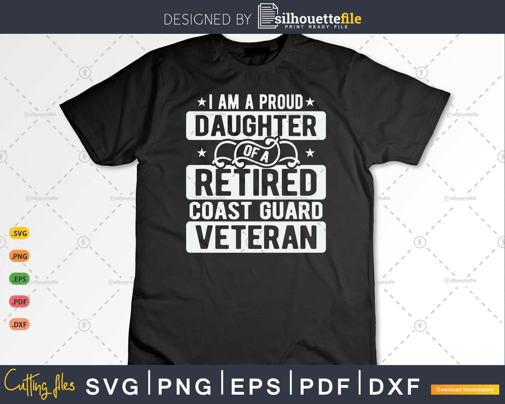 Show your pride with our exclusive digital artwork, 'I'm A Proud Daughter Of A Retired Coast Guard Veteran' SVG, perfect for personalized gifts. Create unique T-shirts, mugs, and banners. High-quality SVG, PNG, DXF, EPS, and PDF files are included. Immediate download available.