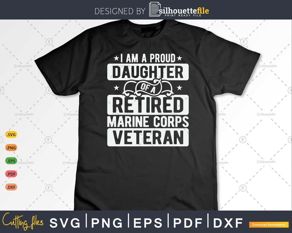 Show your pride with our exclusive digital artwork, 'I'm A Proud Daughter Of A Retired Marine Corps Veteran' SVG, perfect for personalized gifts. Create unique T-shirts, mugs, and banners. High-quality SVG, PNG, DXF, EPS, and PDF files are included. Immediate download available.