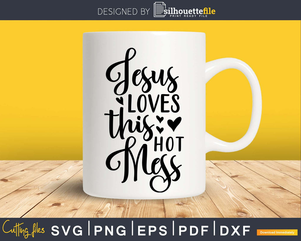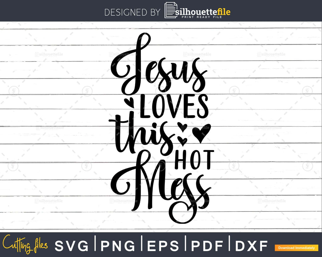 This cut file includes Jesus Loves This Hot Mess Funny Saying SVG DXF PNG Designs digital vector files. Perfect for Cricut or Silhouette projects to make t-shirts, mugs, pillows, wall arts and, etc.